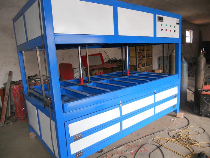 其機器主要構造是由給料、拉料、上下電加熱爐、下閘、多功能可調尺寸、下模盤、上模、上閘、刀閘、切片、放片及配以真空裝置等構成;